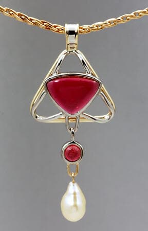 This 950 TruPd palladium and 14-karat yellow gold pendant contains cabochon tourmalines and a cultured freshwater pearl. It is an excellent example for illustrating the superior white color of palladium in contrast with yellow gold.