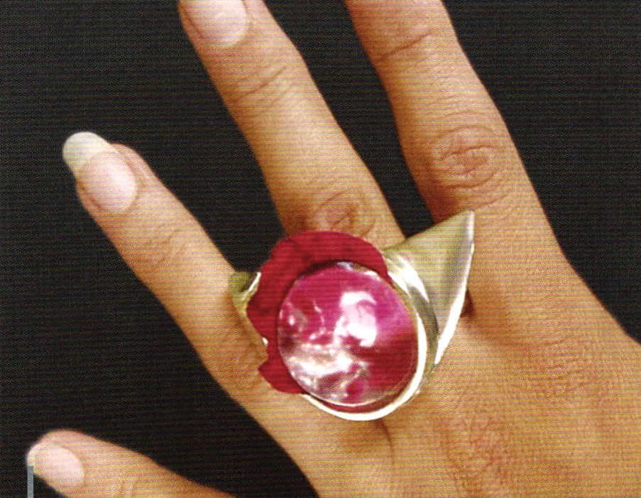 Ring with reversible glass ball by Marlene Knuth. Silver, with rose petal (above) or silver paper inserted, 2006