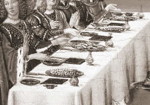 Tracing the history of the fork through paintings shows that in the fifteenth century it continued to be a symbol of the dissolute life. For example, two panels (1484-91) by Italian painters Francesco and Raffaello Botticini on the praedella of the Tabernacolo del Sacramento in the Tuscan town of Empoli make interesting moral contrasts. On one side is the Last Supper with its sober table, few plates, and no forks. On t other is the banquet of Herod, where the head John the Baptist is being presented to a table very rich banqueters. Here the tablecloth is ornately embroidered and each diner has his or her own trencher, ecuelle (squat tureen similar a porringer), knife, and gold fork. The guests do not face each other, but view a tiered display of silverware, as was the medieval custom. The panel would have symbolized decadence to the congregation, which would have seen forks useless luxuries.