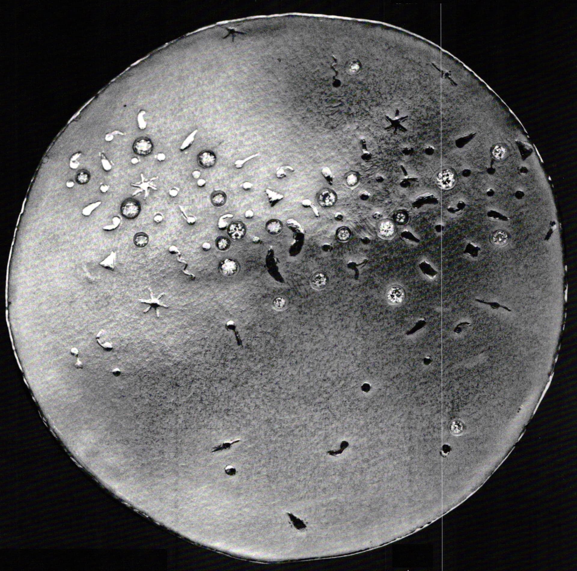 The first step in creating this effect was to establish a subtly irregular surface by rolling the gold through a mill between sheets of paper. After annealing, the sheet was rolled again, this time against a template of brass that had been prepared by piercing. The result was a sheet metal with low relief areas. A circle was drawn freehand and cut out; then the edges were thickened by upsetting them with a light cross-peen hammer.