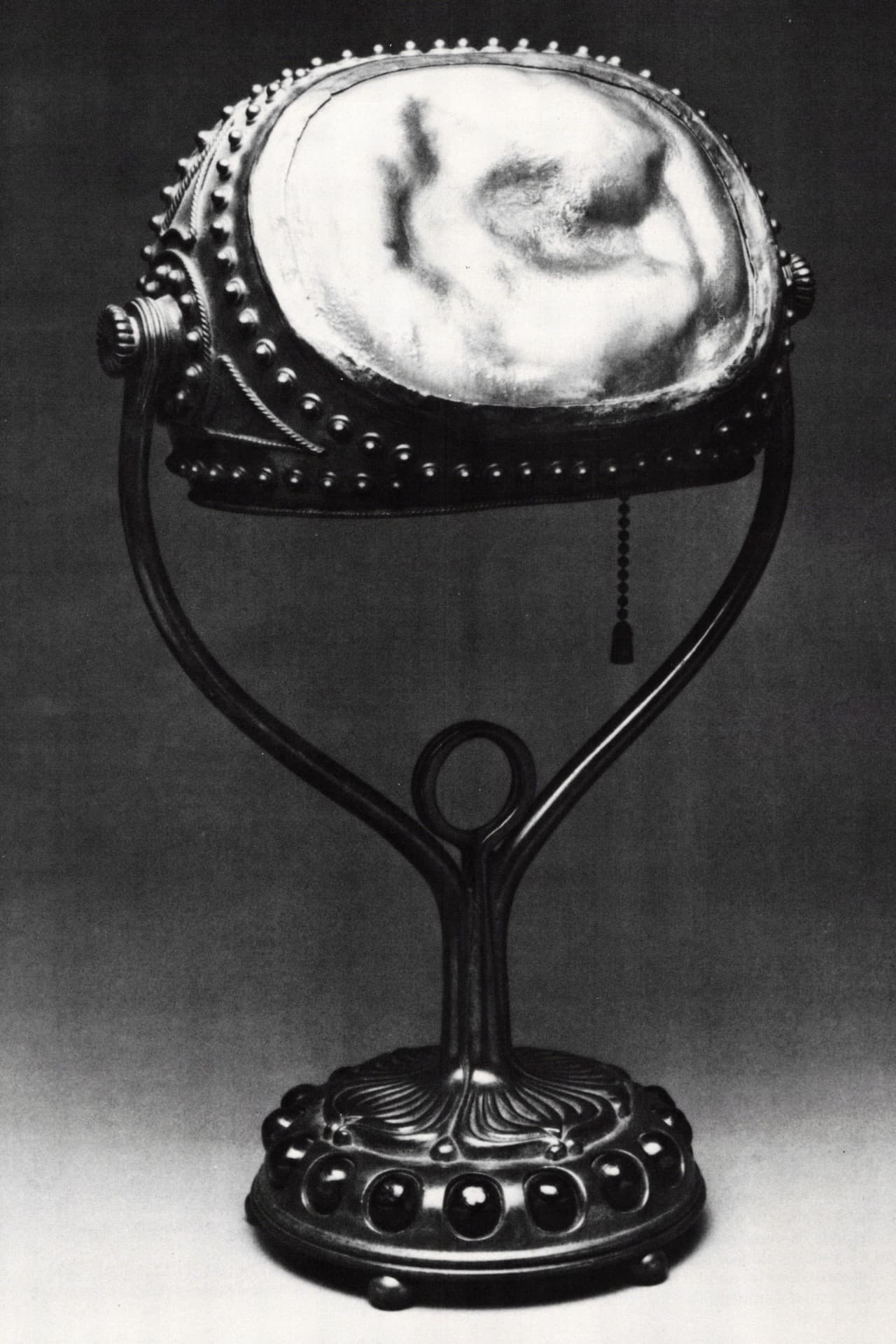 At the opposite end of the philosophical spectrum from Stickley and Hubbard was Louis Comfort Tiffany, son of the founder of Tiffany and Company jewelers. While the latter unabashedly made luxury items for the rich, the former was involved with making utilitarian objects to meet "the needs of the people." Like all Arts and Crafts proponents, however, Tiffany frequently used American motifs and was concerned with the nature of materials and the importance of process. His prime interests were stained glass windows and decorative glass vases, but his firm, Tiffany Studios, also produced a large variety of decorative accessories including lamps, desk sets, plaques and containers. His studio employed several women who made important contributions in the field of metalwork. Patty Gay and Julia Munson, working out of Tiffany's home in New York City, managed a small female staff experimenting with enamels. Impressed with the work of Lalique, Tiffany encouraged these women to produce enamels with an iridescence and vitality that would rival faceted gems. Another female metalworker, just beginning her training, devised a unique method for cushioning her sheet of metal while doing repoussé work. It is said that Tiffany preferred the results of the new technique, created by this unnamed woman, to those of the professionally trained Englishman sitting beside her.
