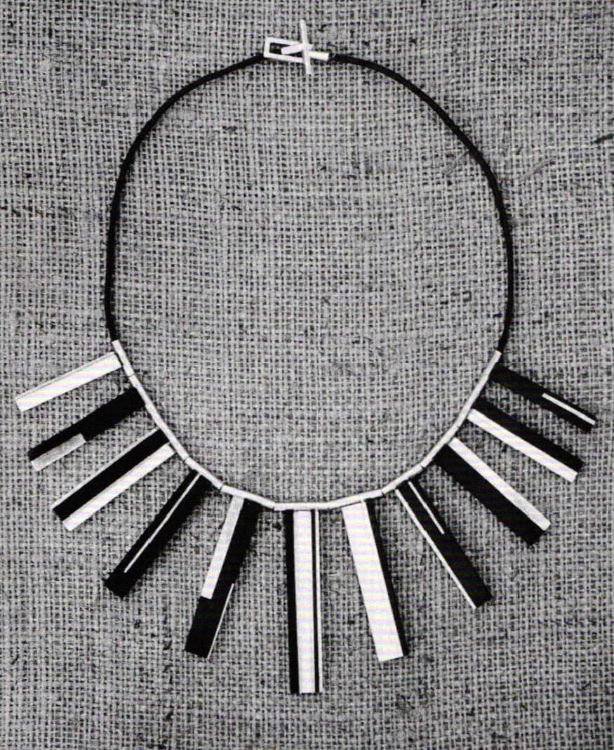 Wilson cannot say enough about his debt to Margaret de Patta. Their mature work is similar in its common constructivist roots. Yet Wilson's style is often more lyrical, occasionally leaning towards an abstract narrative rather than complete nonrepresentation. The viewer can sometimes perceive animal or vegetable allusions (Figures 1 and 2). And Wilson's jewelry is more concerned with surface treatment, while de Patta's explores interior space and optical illusion. Several pieces, such as a silver, ebony and ivory necklace consisting of slender linear elements that recall piano keys (Figure 3), are closer in concept to Macchiarini's (see Metalsmith, Winter 89, p. 34) than to de Patta's. And Wilson, along with Macchiarini, was one of the first jewelers to experiment with silver combined with diverse materials such as wood, ivory and bone. But Wilson reveres de Patta and praises her role as "teacher" to the MAG membership.