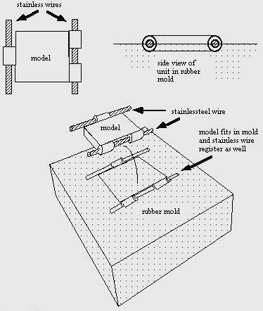 The model for a cast hinge is constructed carefully, accurately and with conscious planning for shrinkage and ease of finishing. Normally, in order to ensure a good wax model for a hinge, one has to make metal insert additions in the rubber mold that is injected with wax. One installs in the rubber mold a high-polished, stainless steel rod that lies where the hinge pin will lie in the final model, stuck through the tubing on the metal casting model when the mold is made and cut. The wire projects out of the ends of the hinge on the model. The wire then has built-in supporting grooves in the rubber mold, which allows the wax to flow around it thus producing a perfect, highly polished hole in the wax tube. It is thus anchored in the mold and registered.