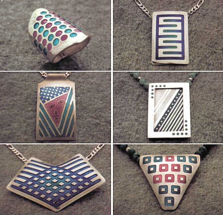 | Samples of champleve jewelry created using a milling machine to engrave the recessed surfaces. All pieces shown are by Sam Gorelick. |