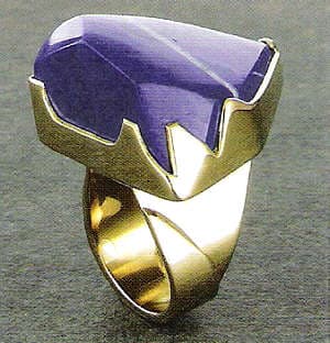 | Rings. ca 1980 Left: 18k Gold, Sugilite, Coral, Turquoise, Charoite Height: 1 1/2′ CTnter: 14k Gold, Lapis Lazuli, Charolite,, turquoise Right: 18k Gold, Sugilite, Coral, Lapis Lazuli, Turquoise |