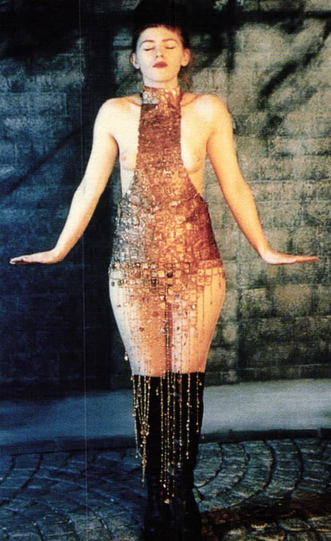 Charlotte's forms wrap the female in chain mail, heavy metal straps, chased and ornamented sheets of metal, and delicately fabricated squares of silver. The ghost-like quality of what is missing is potent in Charlotte's work. Armor encased torsos are often padlocked in some way. Charming is a lovely vest of constructed silver units chained together. There are boxes of chocolates, filigree gates, a square of key holes, a window through which we glimpse a nude woman, and a tiny padlock covering the heart. In Dance the hinged metal torso is locked from behind. In On The Surface the lock hangs below a chased metal vest suggesting the weightiness of the garment, and a chaste enclosure for the chest, the heart, the whole woman.
