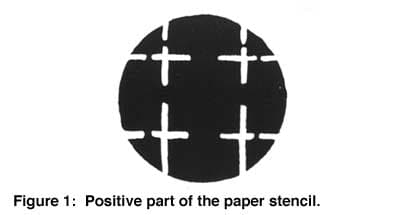 Choose any kind of form; dish, bowl, or plate, flat copper for a wall piece, just about any shape or form will work with this procedure. After choosing a form, contemplate the shape and interior space. Roughly up to half of the space should be designated for the negative part of the stencil (open part of the stencil - opposite of positive part shown in Fig. 1). Industrial brown paper towels work well as stencil material. Prepare the copper for enameling, and cut the stencil to your design. Place the paper stencil over the copper and wet it with water - an eye dropper works well to apply the water. Saturate the stencil with water until completely attached to the copper.