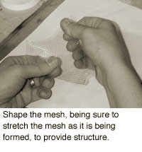 Before you begin working, you will want to protect your finger tips using tape, to prevent cuts and abrasions. I use Guard-Tex, which can be purchased from many jewelry tool and supply companies. Using scissors, cut out a shape. You will then STRETCH and bend the mesh into a three-dimensional shape. Stretching is important because it helps prevent the form from collapsing and sticking to the mica when fired in the kiln. Next, classify the enamels by sifting. I recommend using 80 mesh as your leading color and 150 or 325 mesh as your additional fill in colors.