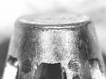 Another reported source of embrittlement is contamination from lead formers. Manual working, such as raising, and repair operations often involve hand-working on a soft former, frequently made of lead, to prevent surface damage. We know of an example of embrittlement in which lead from the former contaminated the surface of the gold, with the lead diffusing into the gold during subsequent annealing or soldering. This contamination can lead to embrittlement and failure of the jewelry item. Because of the possibility of such contamination that can lead to embrittlement, the use of metallic lead in contact with gold is risky. If the technique is considered essential, the gold should be separated from the lead with a tough grade of paper.