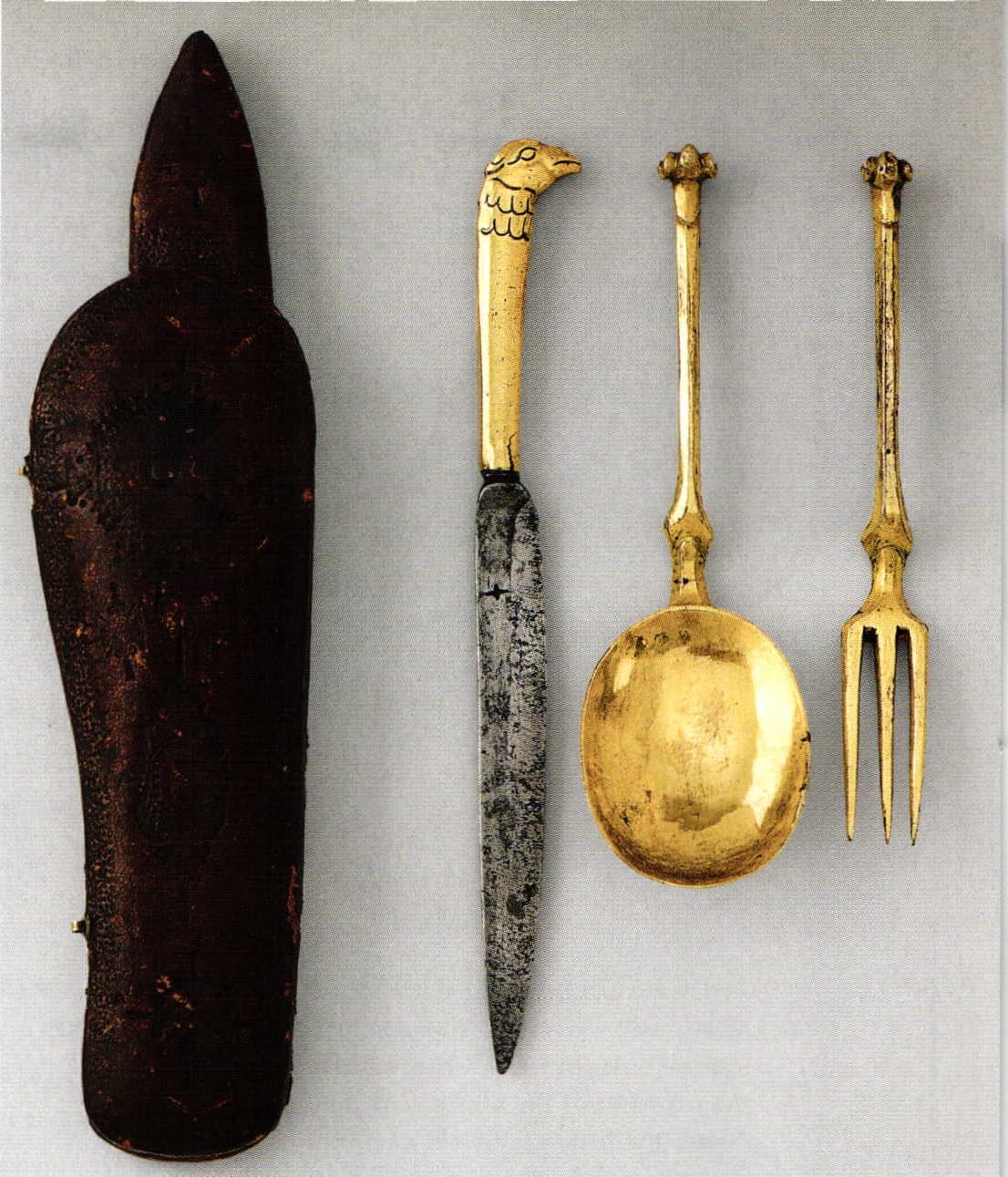Diners in the courtly age had to be satisfied for a long time with just spoons and knives, which they also brought along with them. At the belt hung a sheath containing one's knife, the function of which gives us the word "cutlery." At the tables of simple folk there were only two or three knives in all, and those sharing the meal also found themselves taking turns to slice off a piece of roast. The use of the table knife began to spread at the end of the 16th century. From then on, elegant houses offered each guest a knife with his or her meal. The fork made its appearance on the scene relatively late. As legend has it, a first timid attempt to introduce the fork was made in the 11th century by a Byzantine princess who went to Venice as the wife of the doge, bringing this table custom along with her to the canal city. These particular utensils bore little resemblance to our forks, however. Used in the Near East since as long ago as the 7th century, they were sharp, two-pronged carving skewers that held pieces of meat more securely than the sharp knives that had earlier been used The Venetians used the new utensil to advantage when eating blackberries, raspberries, and cherries, because they did not want to stain their fingers.