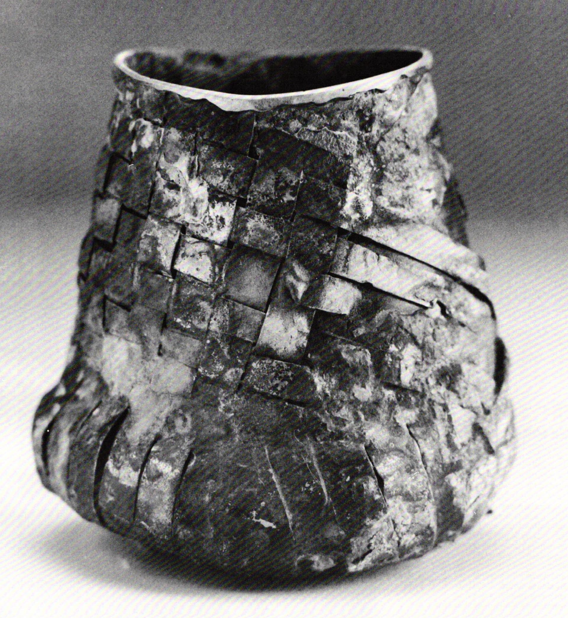After all this reworking and manipulation it is surprising that in Bacharach's finest pieces his original sense of spontaneity still endures. His small gaming cup is a fine example. Its unpretentious appearance conceals the many hours and rareful planning that went into its creation. The bulging base of this cup, pierced by numerous vertical slits, seems as if it is straining to burst its seams. Above this swelling, Bacharach has incorporated a woven section, slightly skewed, so that the unwoven weft strips at the edges form diagonal lines. These lines continue around the piece, visually forcing the observer to rotate it. On the opposite side the diagonal strips criss-cross over a solid background before recombining into the woven section. The cup's rough texture and heavy patination not only add life to this inert form, but also help to unify it. The brass rim which tops all his vessels, satisfyingly completes the piece.
