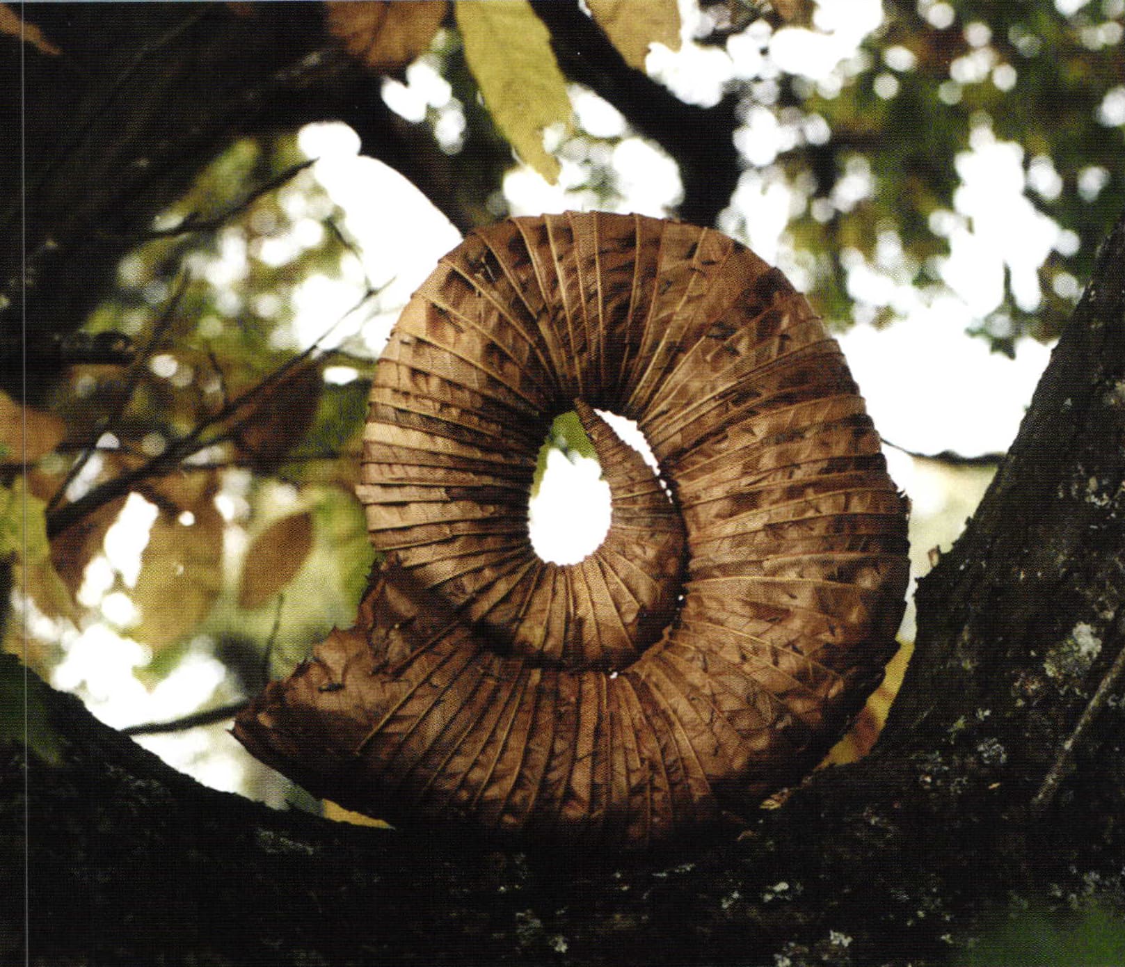 Goldsworthy uses the most widely varied materials found in nature, such as sand, loam. stone, ice, snow, ferns, leaves, wood, and flowers, to create filigreed constructions or powerful sculptures, all of which show an innate, deeply moving poetry And all of them have another thing in common: the inevitability of their transitory nature, whether they are sculptures made of found driftwood or yard-long snakes made of leaves knotted together and then set atop a river current. His sculptures of ice and snow melt in the sun, plants decay, and a single gust of wind can destroy a mobile made of spiderweb-thin stalks bound together by thorns. This very transience is part of Andy Goldsworthy's guiding principle. Where other sculptors take things out of nature and give them new life in other places and different contexts or add artificial materials to them, Goldsworthy's creative process, which is based more on arranging than on producing, has nature, with all its creative and destructive processes, at its center. He does not carve images from the materials he finds in nature as other sculptors would, but rather changes them and brings them together in new compositions. Dead twigs, wilted leaves, wood, and stones, all generally collected in the same place where he creates his works, find new life in Goldsworthy's hands.