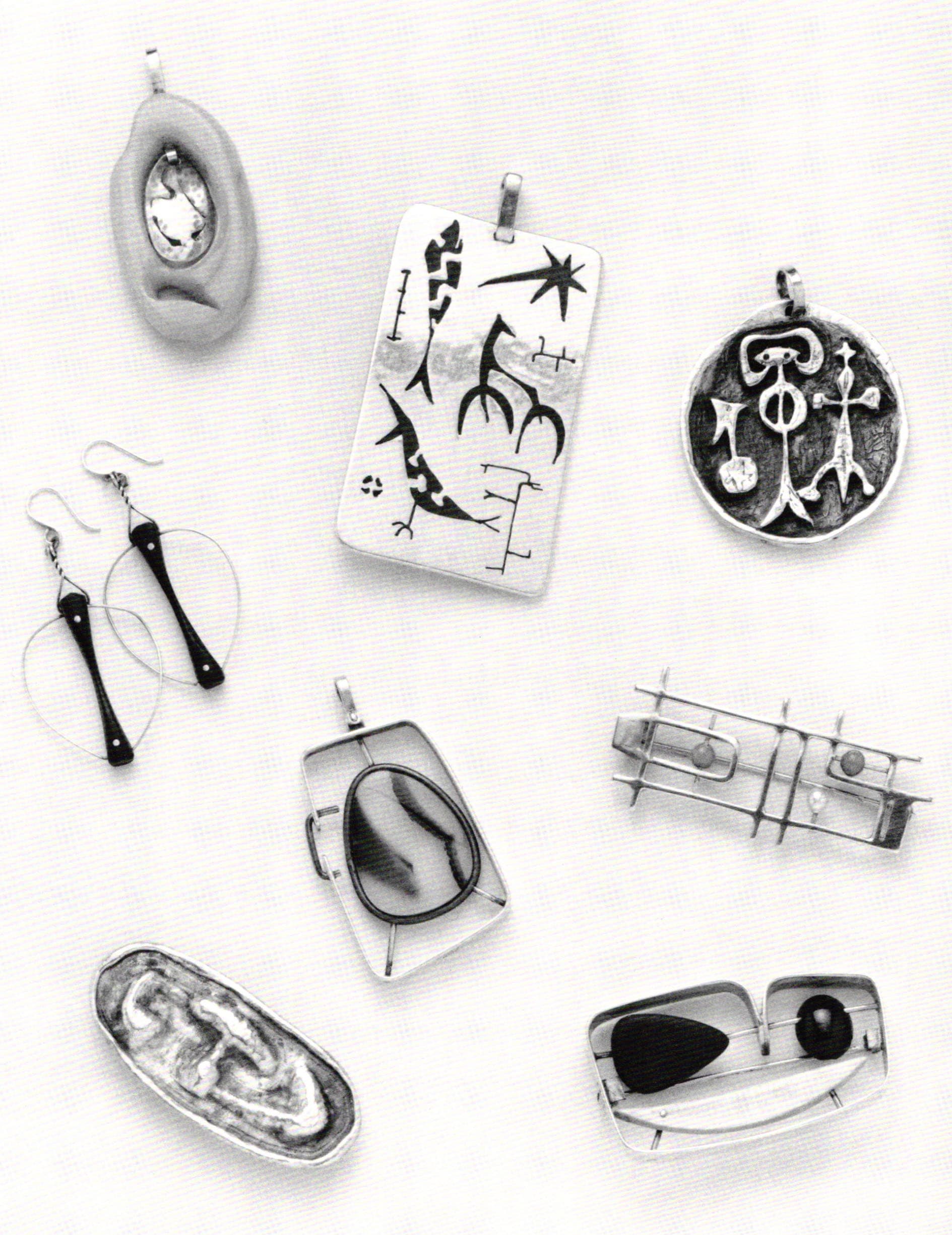 Alexander Calder's esthetic was admittedly the greatest influence on Ed Levin's jewelry in those early years; that and a passionate love for the ancient and tribal informed his designs. One of Levin's first and most successful pieces was the Fruit brooch from 1952. Exhibited in "Designer Craftsmen U.S.A. 1953" at the Brooklyn Museum, it stylistically typifies the era. The brooch is comprised of teardrop, crescent and bullet-shaped forms of ebony, amber and ivory, respectively, which have been pierced by silver wires attached to a surrounding silver frame. The configuration is reminiscent of the lines and shapes of a contemporaneous stabile by Calder of the whimsical images seen in paintings by Miro or Kandinsky, or in monotypes by Bertoia. The Dove pendant reminds one of Braque's mythologically inspired jewelry, while another brooch Egg Box Construction from 1958, recalls the paintings of Mondrian. It too utilizes openwork styling along with suspended forms; in this piece beads of pearl, coral and jade are speared through their centers and are thus linearly suspended. All in all, the jewelry from the 1950s is consistent with the work of Ed Wiener, Betty Cooke and Milton Cavagnaro, to name a few of Levin's peers on the East and West coasts.
