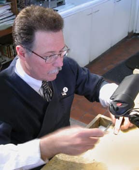 Seated at his bench, David Howard, owner of My Jeweler, Inc. in Albuquerque , NM contemplates and prepares his work for the day. Technicians at My Jeweler perform repairs while customers wait in addition to the constant flow of design and custom order work.