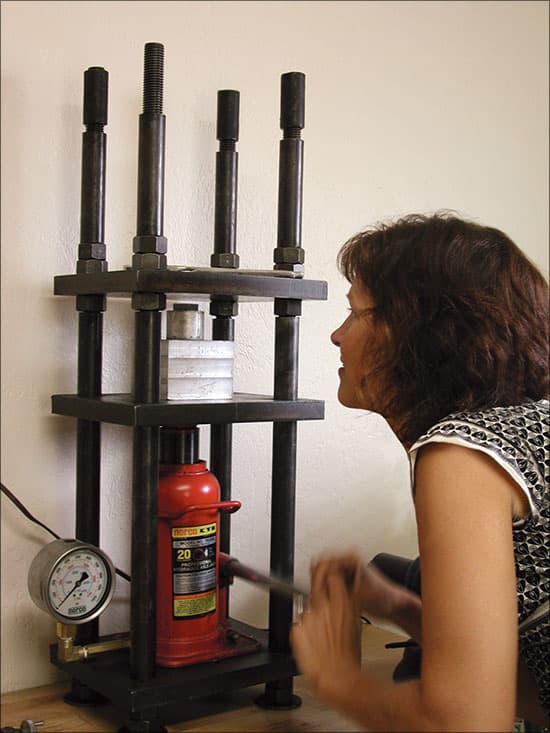 I've learned a lot about making dies using the hydraulic press. To create the female die into which the metal is pressed, I usually either carve it out of aluminum or make it out of liquid steel. I also cut shapes out of heavy-gauge aluminum sheet and Plexi Glass — more common techniques.