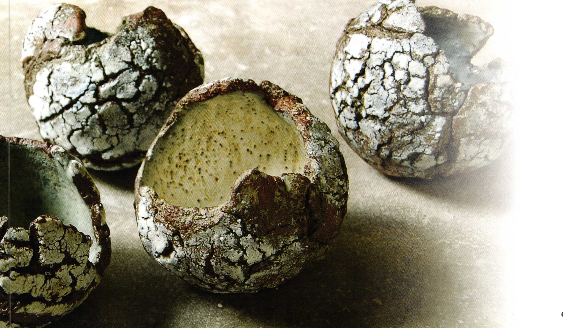 The ceramic bowls by Japanese artist Yoshimi Futamura, now based in Paris, are reminiscent of tree bark or a loaf of bread. The artist combines sound and porcelain in her works, covering the surfaces with an ash glaze