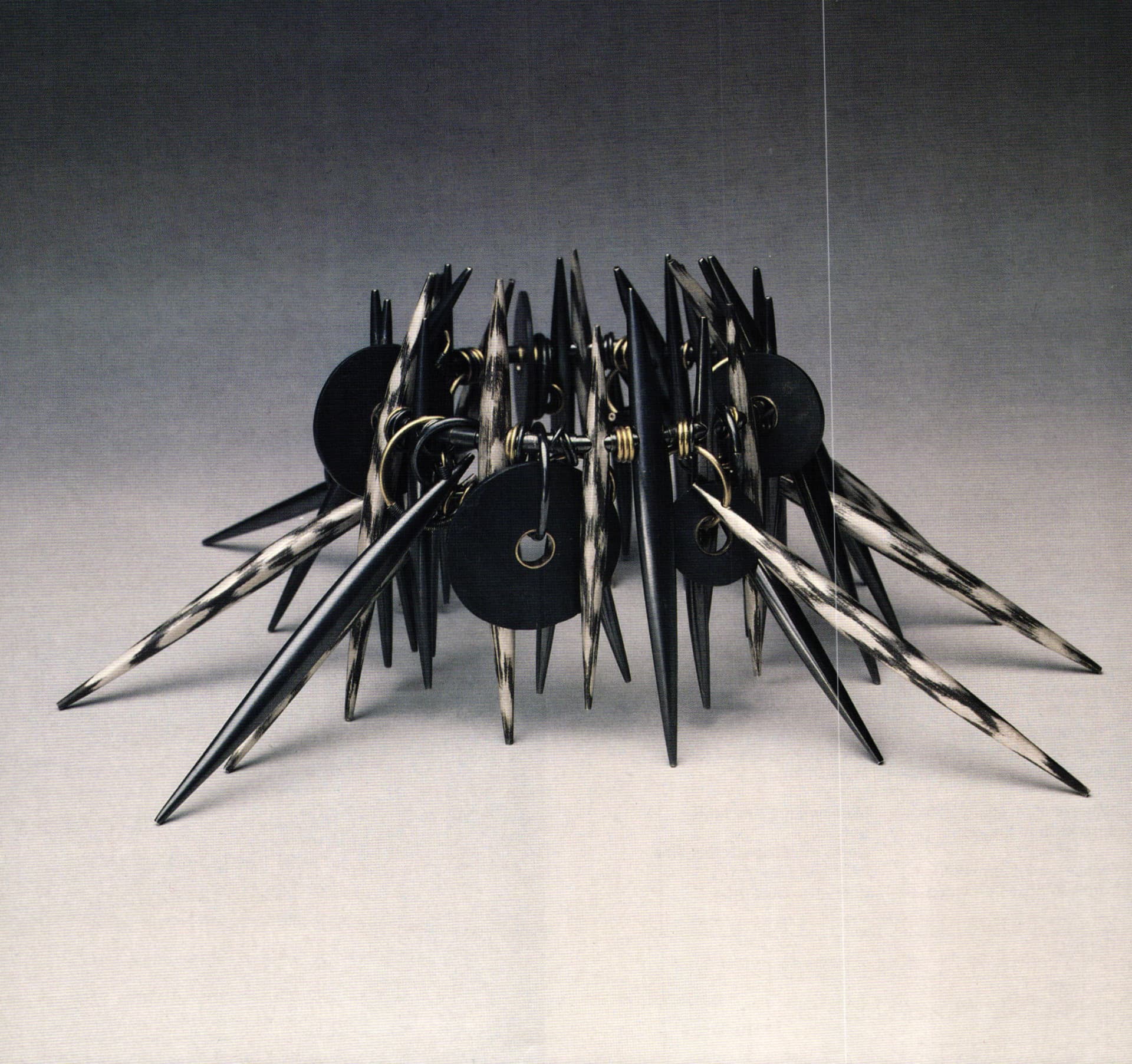 At 9½" in flat diameter, the overall form of these bracelets takes on the super scale we have previously encountered in the recent linear pins. But upon, the tiger stripes and the inevitable jungle associations, a new referent is introduced—tribal modes of body adornment. Repetition, seen clearly here in circles and tapered spikes, is a frequent factor in primitive jewelry. Once again, the very basic sexual nature of these forms cannot be denied. They remind us that the very wearing of jewelry (in more than just tribal worlds) is frequently a means of transmitting sexual messages—availability, status, prowess, accomplishment, in addition to the obvious attempt to seduce. But there is more. Raised up on the tubular tips, the artist's preferred installation, these bracelets suggest the controlled energy of an animal poised to strike. Inherent tension, indeed, impending danger are implied. Not only do they at first seem dangerous to wear, but they are dangerous for anyone who gets too close. The implications of spikes, daggers. Spears and the slate shields all allude to the weapons employed by a battling tribal people. Those battles pit man against man, against beast, against woman. And so the bracelets take us full circle, back to the universal sexual struggle; pulsing visually, pulsing sexually. These bracelets with all their physical and psychological weaponry are truly dramatic sexual statements.