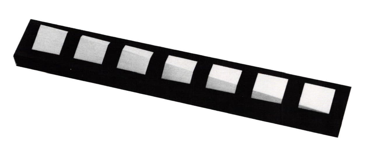 The three brass paperweights were sanded block forms, each with the front upper edge cut, leaving a shiny facet. The facet increased in size from the left block to the right. When placed side by side the three paperweights would read as one design, yet when separated, each form would function successfully as a single design. This work is deliberately void of elaborate detail, Niikura believes that metal should express his feelings and ideas in the purest, simplest form.