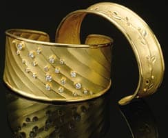 | Two of Heinrich's 18K gold hand-fabricated cuff bracelets, one with a chased grapevine design offset by diamonds, the other with chased lines and bezel-set diamonds. |