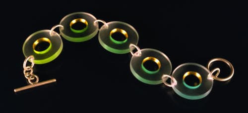 McCreary is no stranger to traditional jewelry making. She took her first job with a jewelry manufacturer in the early 1970s, and spent several years casting, mold making, and model making for jewelers while she studied for her B.F.A. But when, after graduation, she decided to design and sell her own work, she turned to the material she had experimented with in college.Her current work features clear acrylic with colored lacquer applied to the edges or carved areas, and 22k gold leaf applied over the lacquer. "When you look at the piece, mainly what you're seeing is the clear of the acrylic, the whitish translucence, and the 22k gold leaf — and then the color bleeds out from behind it," she says. "It makes the color seem a little more mysterious."