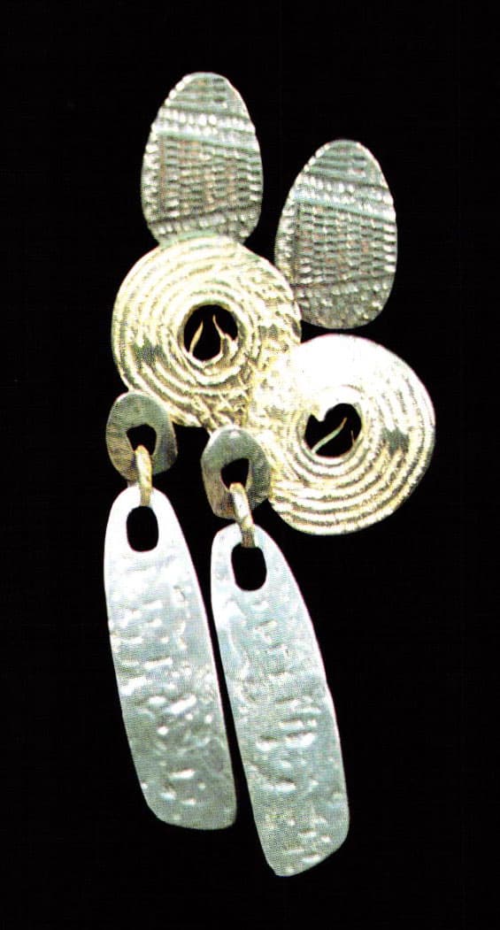 The beginnings of O'Rourke's jewelry making coincided with the end of her first marriage. Most of her early pieces were large, flat-hammered silver, inspired by Egyptian and pre-Columbian designs. She made a linked belt of elaborate brass eagles, wings outspread and overlaid with silver feathers and each one with a turquoise eye. After the belt she created arm-cuffs to be worn above the elbow, large earrings, and a breastplate that draped from the collarbone to the back.
