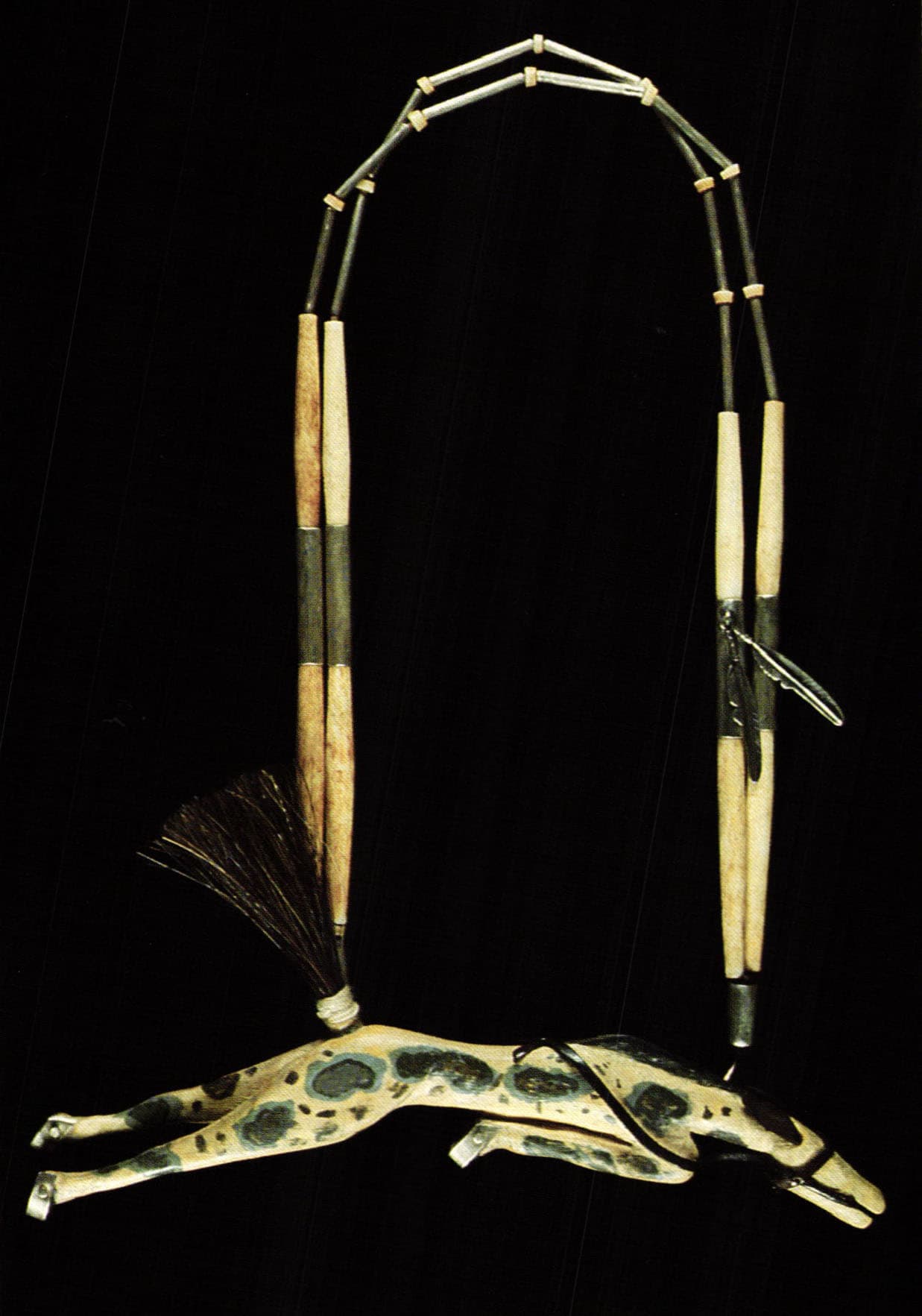 Wild Appaloosa (1983) was inspired by the original eight-foot-long antique Sioux Indian "Horse Effigy" at the Tate Gallery, which she wanted to show in a new way in her jewelry. Worn correctly on the diagonal, the horse is a memento of the warring, moving spirit of the American Plains Indians, and probably of Hall's own restless energy.