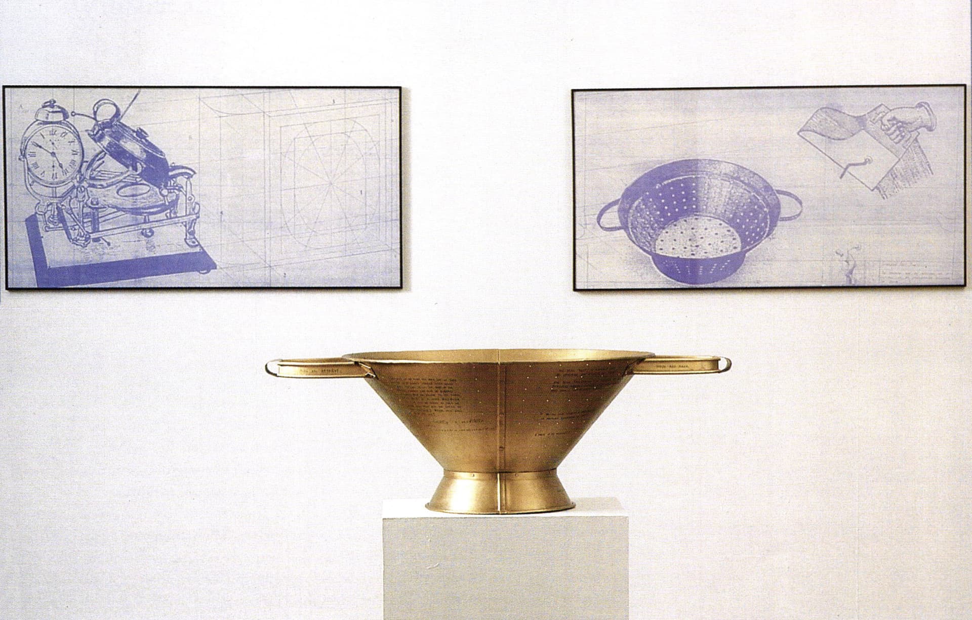 Lisa Norton wants to find a worldly corollary rather than an academic one for her art form. She references not only anonymous makers but also anonymous designers, refusing to only draw authority from an elite world of art historical quotation. The work Studying Lost Time sculpturally depicts a food strainer made hyperbolic by its size, pristine finish and repetitious, linear rows of holes. In this work the diagrammatic element is rendered as in an instructional manual, displayed heraldically around the strainer on two wall-mounted blueprints, which illustrate the physical characteristics and dimensions of the colander, its practical function, and an old fashioned line drawing of a time piece. The bronze sieve is replete with texts that speak of time; however, it is entirely unclear as to which conceptions of time the voices are referring. Clearly the voice of the Industrial Revolution speaks to efficiency, expediency and production as an authority in punctuated blasts: "THE ANTIDOTE IS USEFUL OCCUPATION", or "'LOST TIME'…OCCURS WHILE WAITING FOR SOMETHING TO HAPPEN". Other phrases express a more human element apart from simply one's labor, yet the phrases still have the tenor of wives tales, substituting hollow clichés for genuine reflection.