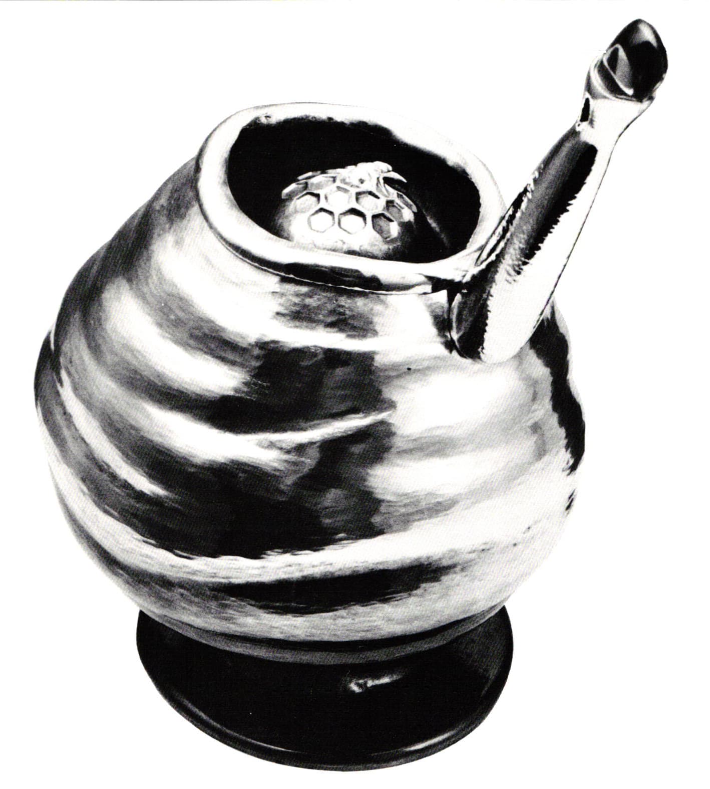 The repoussé and chasing that shape the surface of the Spice Shaker are as extreme an example of those techniques as one might find in any historical gold- or silverwork. While the Honey Pot is less intense in surface handling, it holds to the same idea of stretching material limits and refining technique as a base for exploration. Alternating ridges encircle a swelling curve, flowing into a counter-curved lip that wraps back on itself to form one circular shape formed at 90 degrees to another.