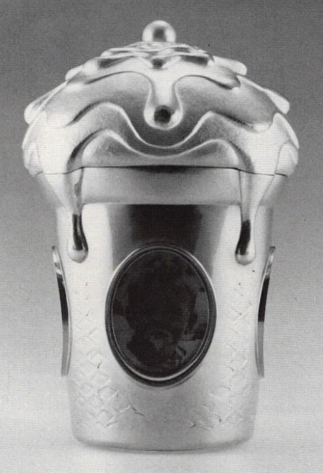 As to style, a taste for intricate yet almost "natural" ripples flows through several of the most beautiful pieces, notably the masterly Spice Shaker. Also characteristic is the way in which silver is successfully combined with other noble materials such as ebony, horn or stone. My favorite examples of this are the Brandy Snifter with its antler stem superbly inset with sterling, and the small ink bottle crowned with an ebony stopper. Among Betteridge's distinctive traits is also a certain teasing humor, particularly in the most recent works, including Ice Cream Cone, Pill Tube with Lips and Tot Cup for an Insomniac.