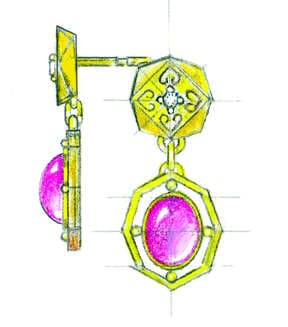 The customer has selected the pair of earrings shown the rough sketch. The top portion is cast, the bottom piece is hand fabricated and the two units are joined by wire links. Materials used in the custom designed earrings include: 14-karat yellow gold with 14-karat white gold settings, Diamonds and tourmaline cabochons.
