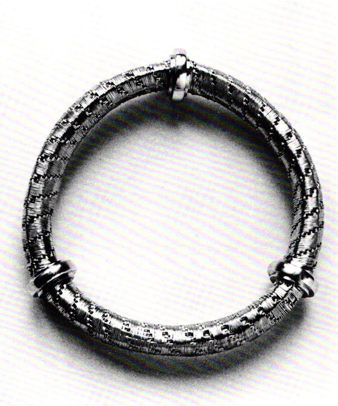 Mary Lee Hu began producing two types of chokers simultaneously—the torque form (adopted by her after being inspired by the series of ancient gold shows touring museums in the United States during the mid-1970s) and the band form. While the torque form is tubular and the band form is generally flat, they share a common design principle. While the earlier work had a frontal orientation, with the neckpiece serving as the support for the pendantlike frontal piece, both the torque and band forms wrap fully around the neck and are meant to be seen in the round. The pieces acquire a sense of continuum. They do not reach outside of themselves but allow the sophisticated patterns and resulting rhythms to flow along the oval, the energy being continued within themselves.