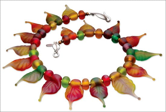 Soon after her first glass bead making lesson in 2000, Smith rented workspace in her instructor's home studio and developed her skills. She began building a clientele, but lacked confidence in her abilities. Her Fall Leaves necklace (right), a six-month project, transformed her into a professional in her mind due to its complex nature and successful result. When molten, the red, orange, amber, and olive green glass look the same. On top of that, the red and orange are "striking" colors — the most difficult glass to work with, says Smith. "When using striking transparent red and orange, you must re-introduce the finished bead back in the flame at just the right time to bring out the true color of the glass," she explains. If the moment is missed, a brown bead results after annealing.
