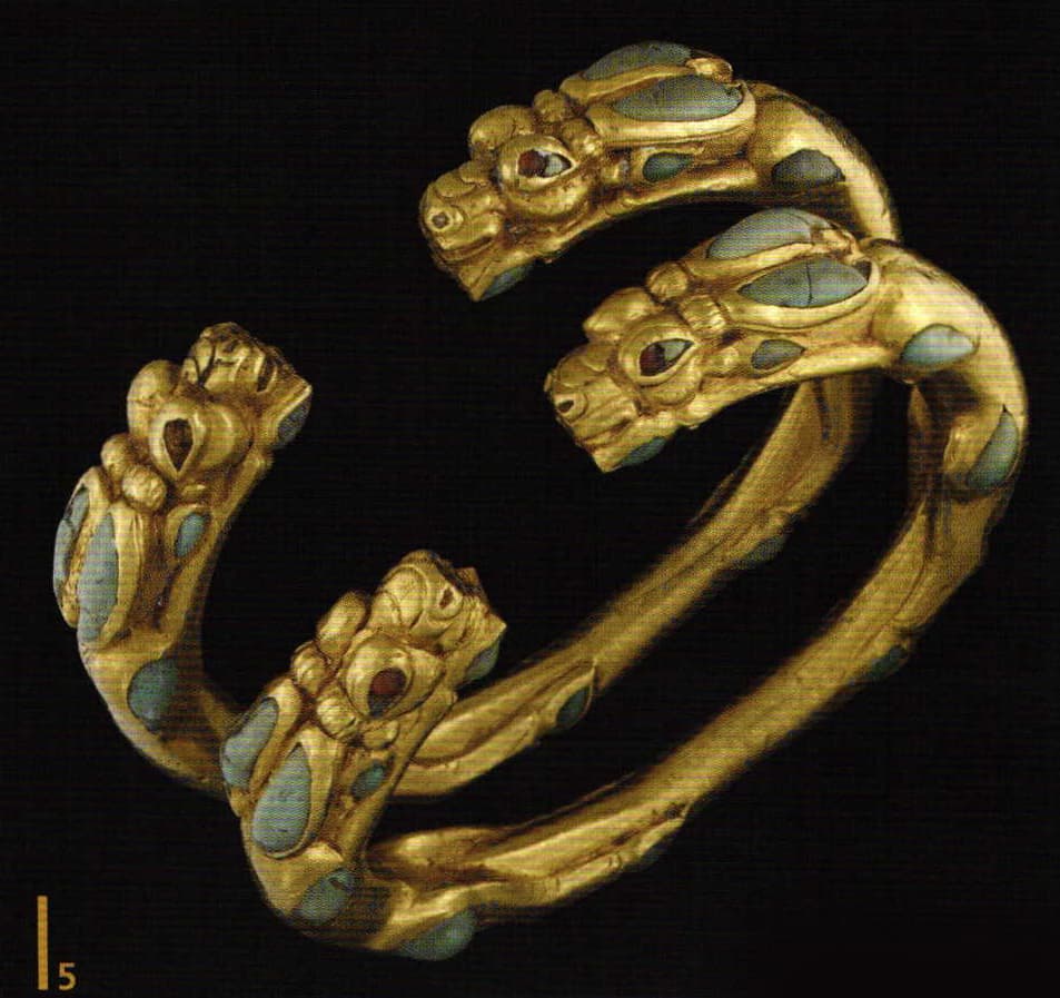 Bracelets decorated with antelopes. Tillya Tepe, 1st century, gold, turquoise, cornelian