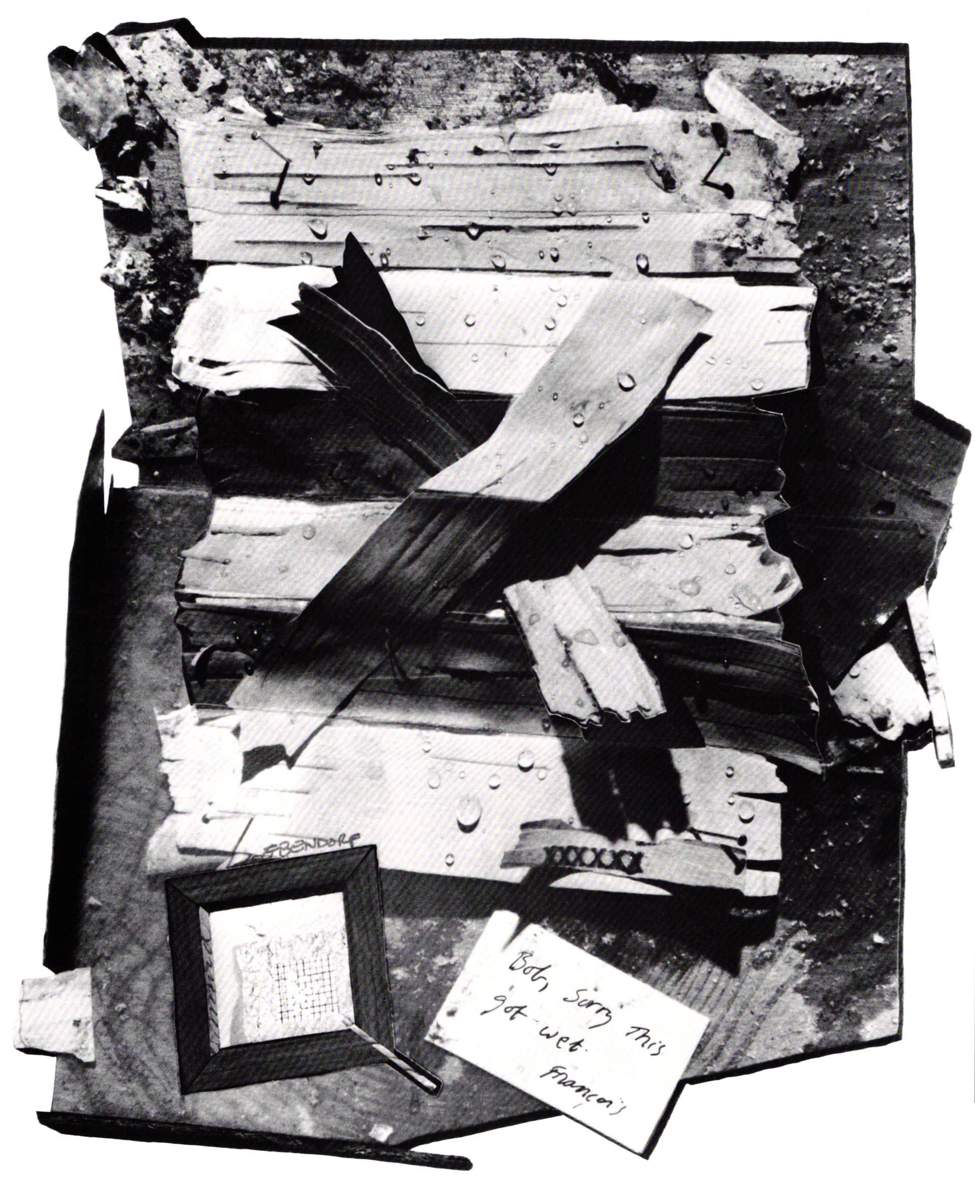 This point is rendered with humorous clarity by one of the 1982 collaborations with Deschamps. A trompe-l'oeil collage simulating richly textured shavings of wood and paper appears to tumble toward the viewer. Startlingly realistic beads of water shimmer on the faux surfaces. At the lower right edge of this photographic composition is a white card on which the photographer cunningly leaves a handwritten note for his friend, "Bob, sorry this got wet. Francois." Here, the communication, so critical to the process and the product, has wittily been acknowledged and incorporated into the final piece.