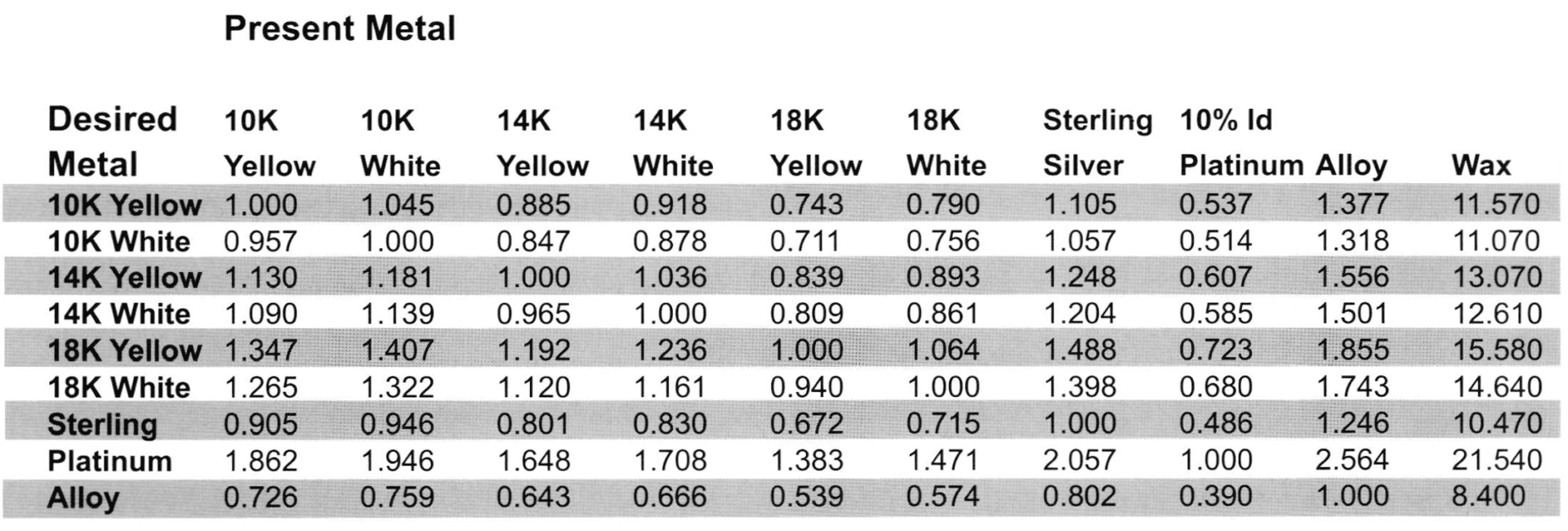 The metal conversion chart below will help you determine the amount of metal needed to create a piece of jewelry in a different metal. To use, weigh the piece of jewelry. Then find the present metal along the top of the chart and look down the column to find the factor for the new metal you desire to make the piece of jewelry. Then multiply the current weight of the jewelry by this factor.