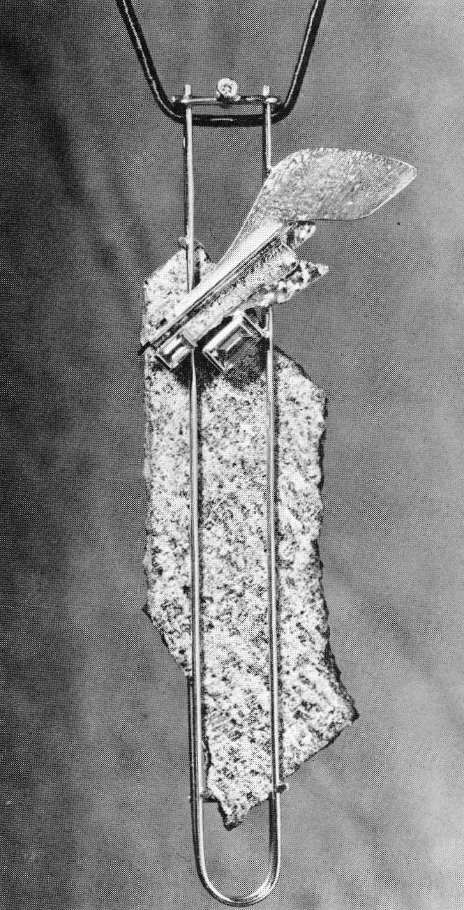 What makes this evolution so interesting is the central problem faced by metalsmiths of developing and maintaining a distinct identity both individually and as a group. Historically, metalsmiths have been perceived as artisans whose purpose was to make objects of functional and/or decorative merit. Their pieces were usually small in size and meticulously crafted from fine metals and other rare materials. Contemporary metalsmiths have become frustrated by the restrictions imposed by this legacy and have begun to experiment with new techniques and materials in a search for an esthetic alternative. Jewelry and Beyond exhibited several new approaches to the field.