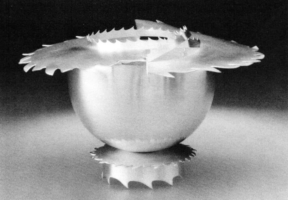 Pritam and Eames has established a reputation as a showcase for fine contemporary handmade furniture. In recent years it has also featured summer exhibitions of hollowware, jewelry, and flatware by America's top metalsmiths. This summer, for the first time, the gallery exhibited work by members of the Society of American Silversmiths. Thirty-eight members submitted a total of 120 objects to the show. About 75 percent of the work can be classed as hollowware; the rest is flatware. Most of the work in both categories reveal by their design that the artist paid primary attention to the requirements of function as well as aesthetics and personal expression. In the minority were unequivocal sculpture and, for want of a better term, "metaphors," objects that relate to some functional ancestor but, because of their design or structure, indicate that if an attempt were made to use them, they would not work well if at all. They also suggest stories or messages that cannot be read easily just by looking at them. An example is Susan Ewing's work, which was visually exciting and technically impeccable. I sensed that there was a personal message in the menacing saw teeth of her fruit bowl. Later I learned that there was - she had experienced a near-tragic accident with a bandsaw.
