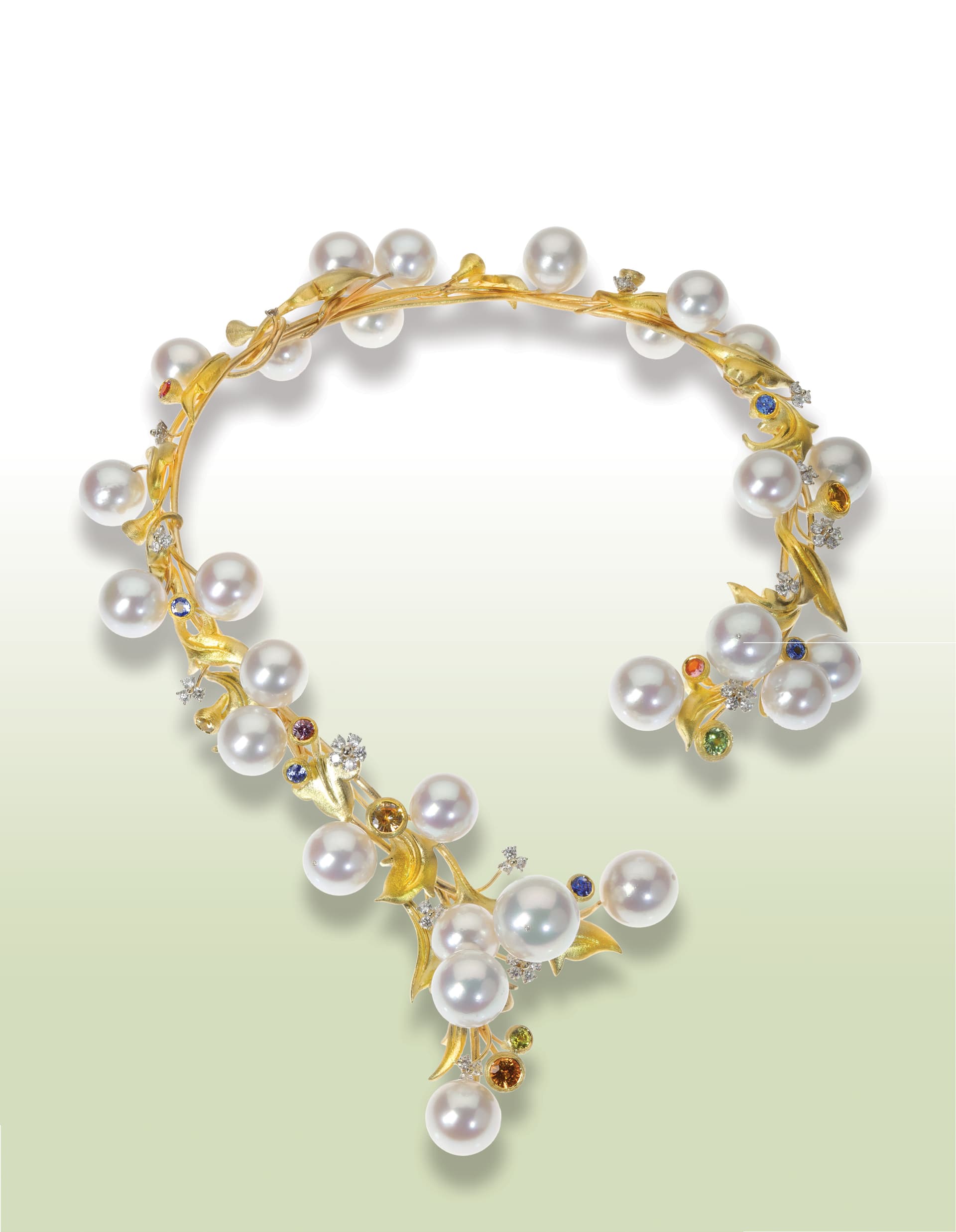 In the finished piece, the main body of the necklace is 18k yellow gold, a choice dictated not just by the client's elevated standards, but also by Smith's vision of how all the colors play together in this idealized version of a garden and vines. "I wanted a rich yellow color against the pearls and colored sapphires," she says. Those sapphires, which Smith chose for their consistent brilliance, simulate flower buds. Some of the pearls are graced with tiny diamonds that simulate dewdrops. The diamonds in the piece are meant as a subtle accent to the visual impact of the whole. "They add a little sparkle, but not so much that they steal your attention," she says. "They add to the orchestration of the whole."