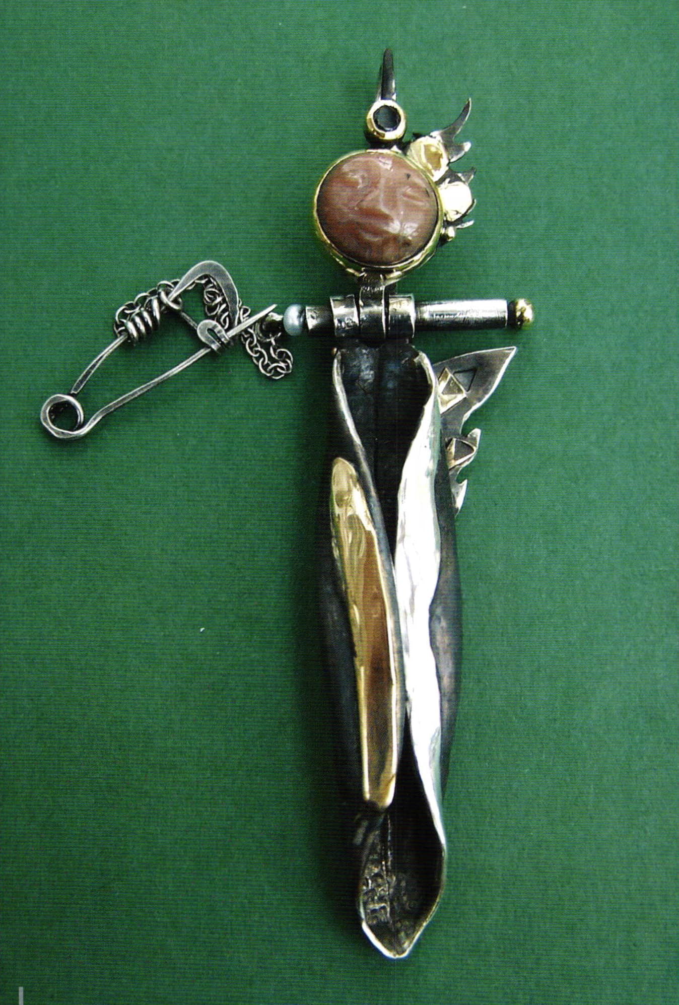 Pendant/label pin by Frances D'Aintree. Sterling silver, hammered, formed, folded, part oxidized. 18 karat gold, brown moonstone, green tourmaline