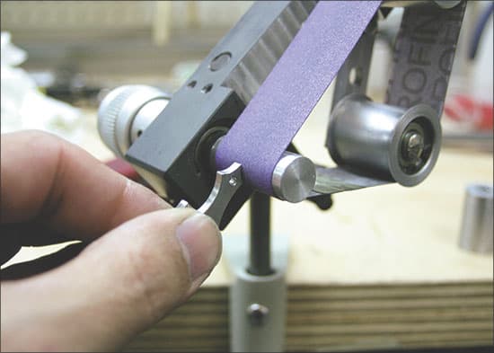 "It's a very nice variable-speed sander that does a great job for its intended purpose," he says. And it's flexible. Pruitt was used to sanding belts moving downward; the Wolf sander moves up and away. No problem. He simply flipped the sander around to get the belt moving in the other direction. (Since then, he's purchased a Foredom that will run in reverse, mitigating the need to turn the sander upside down.)
