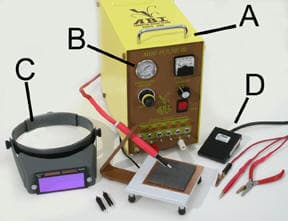 The ABI Mini Pulse III comes with an argon gas regulator (B), the Opti-saver instant darkening flash shield (C), 3 different size welding tips with two sizes of electrodes, brass lined pliers, brass tweezers, an alligator clip, contact pad, welding pencil holder and foot pedal (D) for $2,700.00. ABI also sells the unit without the argon gas regulator or the Opti-saver shield for $2,450.00.