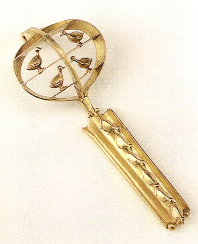 Fike's passion for integrating mechanisms is best seen in his unceasing obsession with the fibula, another body ornament that holds fabric in place. Fike began serious study of fibulae in 1965 during a sabbatical to study the collections of the museums in Rome and Florence. Seven years earlier in 1948 the Detroit Institute of Arts had mounted an Exhibition of Ancient Italic and Etruscan Art including three gold and six bronze fibulae. The DIA provided Fike with a letter of introduction that allowed him to handle, photograph, and extensively study fibulae in Italian museums. "It was then that I woke up to the fact that the fibula was such a great clasp, especially the Etruscan (Vulci, c. 700 B. C. E.). I came away saying I would devote the rest of my metalworking life to the study and making of them."