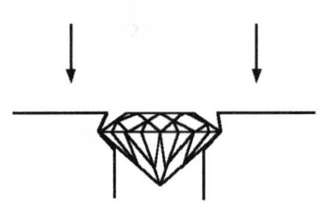 Using a small highly polished burnisher rub metal down and over the edge of the stone. Hold the burnisher at a 45-degree angle and rub around the top edge of the hole. Due to the process of tightening the stone, some setters refer to this setting technique as 'Rub Down Setting' instead of "Flush Setting".