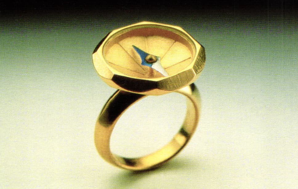 Lately Sherman has been working on a series of rings, more simple and more stripped-down than anything she has designed since she was a student in Munich. Each ring follows the format of the traditional solitaire: the form of a faceted gem on top of a tapered shank. But in this case the gem forms are metal constructions, usually containing an object that relates to the imagery Sherman has used in earlier pendants. One ring has a compass set inside the faux stone; one has a golden watch hand; another has a spirit level with a crosshair fixed above it. In each of these rings, something moves, responding to the movements of the wearer. The most perverse of the rings has a compass mounted inside the form of a round stone, but the stone is joined to the shank with a ball-and-socket. It constantly flops around, frustrating attempts to get one's bearings. As a means of orientation, it holds out the hope of functioning, while remaining amusingly useless. And as pure jewelry, it's as wearable and elegant as the prototype solitaire ring, but without the usual associations of true and constant love. This is a ring for people who understand that relationships are mutable and direction is hard to find.