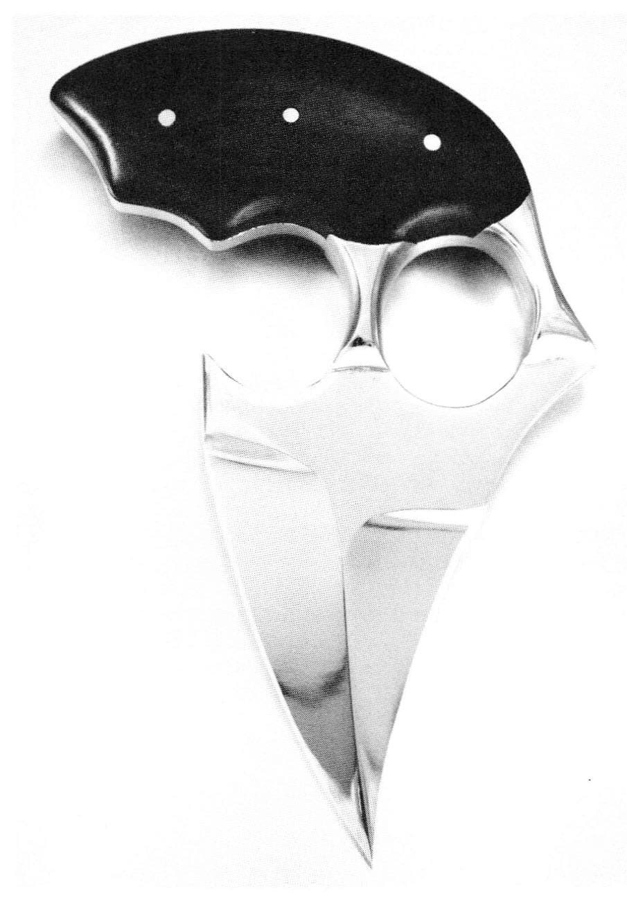 Otterway's interest in metal is two-fold. Best known so far have been her neckpieces and pins incorporating animal bones and skulls and erotic imagery. The pieces are provocative, but they are not without charm and whimsy. A stylized ant's head, for example, has antennae that wrap around the neck of the wearer; a pin incorporates the beak of a squid, enlarged and carved from epoxy, in its imagery. The second interest is in knives, both as personal weapons and as beautiful, organic, forms. Handles are cherry or tulipwood, and blades are steel. There is little additional decoration to compete with the flowing shapes of the knives themselves, almost impossible not to touch or hold.