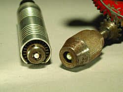 - A three-jawed chuck (see photo), such as that on a hand drill, a flex-shaft handpiece, or a three-jawed miniature lathe, can be used to hold a pearl in place securely. You can remove the flex-shaft handle when using it as a clamp. (Please tighten the tool gently and use a piece of cardboard or cloth to cushion the pearl).