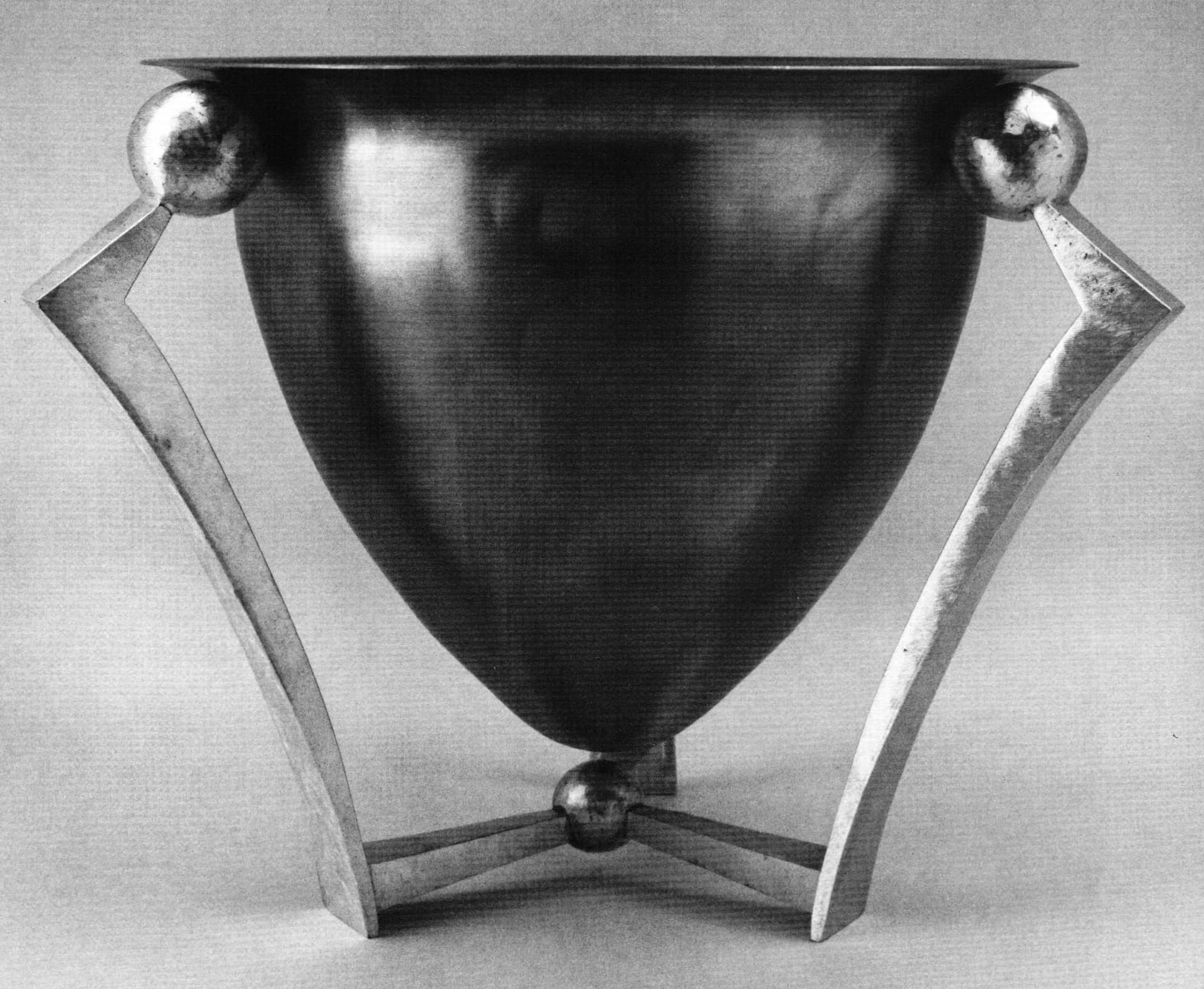 The "floating" or "multi-leg" bowl series, (Figures 3 and 4) consists of three bowl types, or shapes, and a variety of sandcast brass legs. The basic premise was to lift the bowl up off the ground plane and relieve it of the necessity to stand alone by either having a flat bottom or an added foot. The Asian esthetic of displaying objects is evident here. Metalsmiths rarely are able to complete a holloware form without altering it for stability. Here, Markusen finally finds one elegant solution that lifts up the bowl to be admired for all its fullness and sensuousness. The copper bowls themselves were spun outside the studio by master spinner Bernie Towel, who has worked with Markusen for many years.