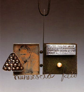 | Minnesota Fats, 1971 Sterling Silver, gold, cultured pearl, magazine photo, plexiglass 3 x 6 1/2″ The Museum of Fine arts, Houston, The Helen W. Druff Collection Photo: Lynn thompson |