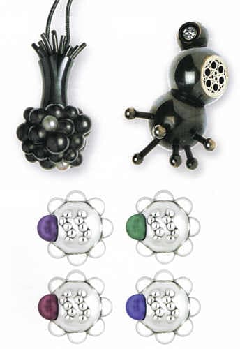 Mounted in Paul McClure's silver pendant, Alveoli, are two pearls taken from a necklace his mother left him when she died of cancer. The work is a memento of her death, in memory of her life. Shaped like the bronchial branches of the lungs, the pendant references the tiny sacs that exchange oxygen and carbon dioxide from the blood.