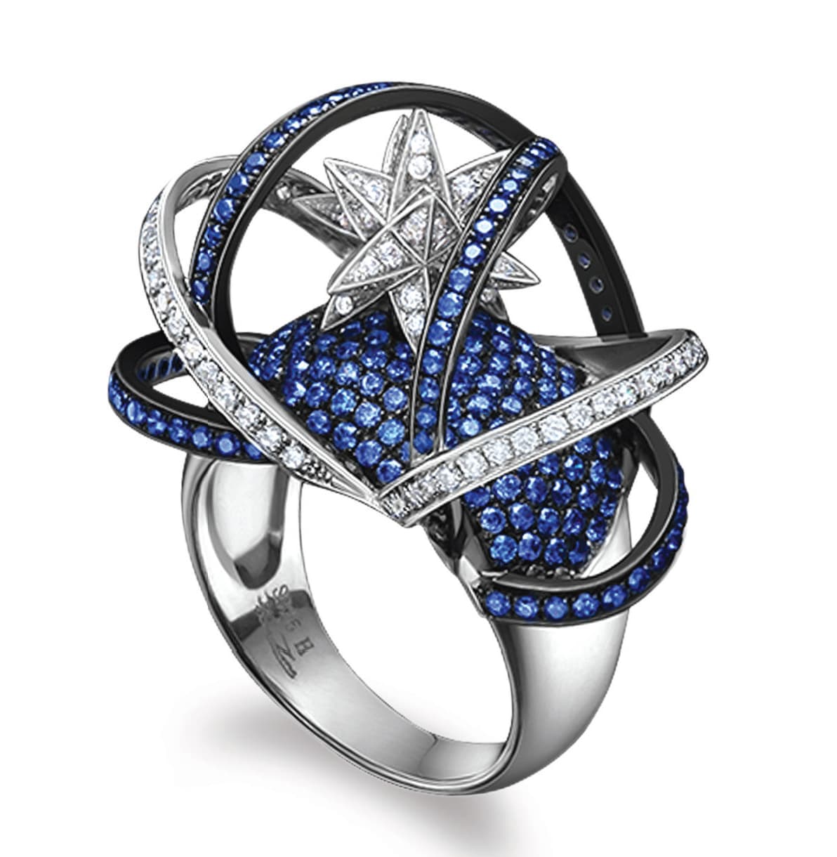 "The contrast of black and white strengthens the visual impact of the push and pull of the universe," she says. "The blue gemstones [which are set in the rhodium- plated sections] are also more eye catching with the contrast. This helps the blue and white gemstones become more radiant and beautiful to each other, matching what you see in the universe when you look up at the night's sky."